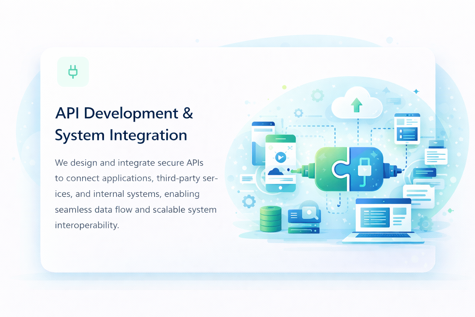 We design and integrate secure APIs to connect applications, third-party services, and internal systems, enabling seamless data flow and scalable system interoperability.